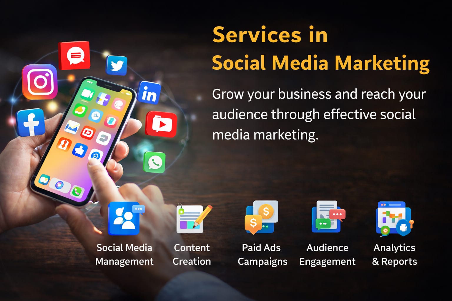 Social media marketing helps businesses connect with their audience, build brand awareness, and promote products through platforms like Instagram, Facebook, and YouTube.